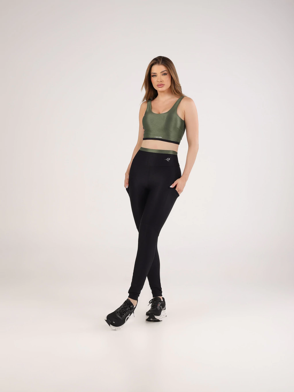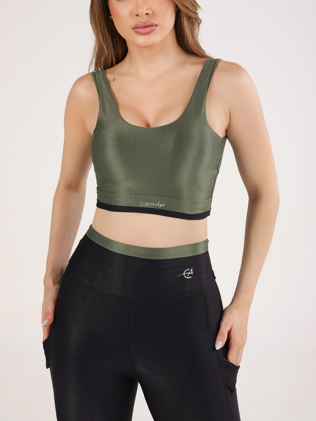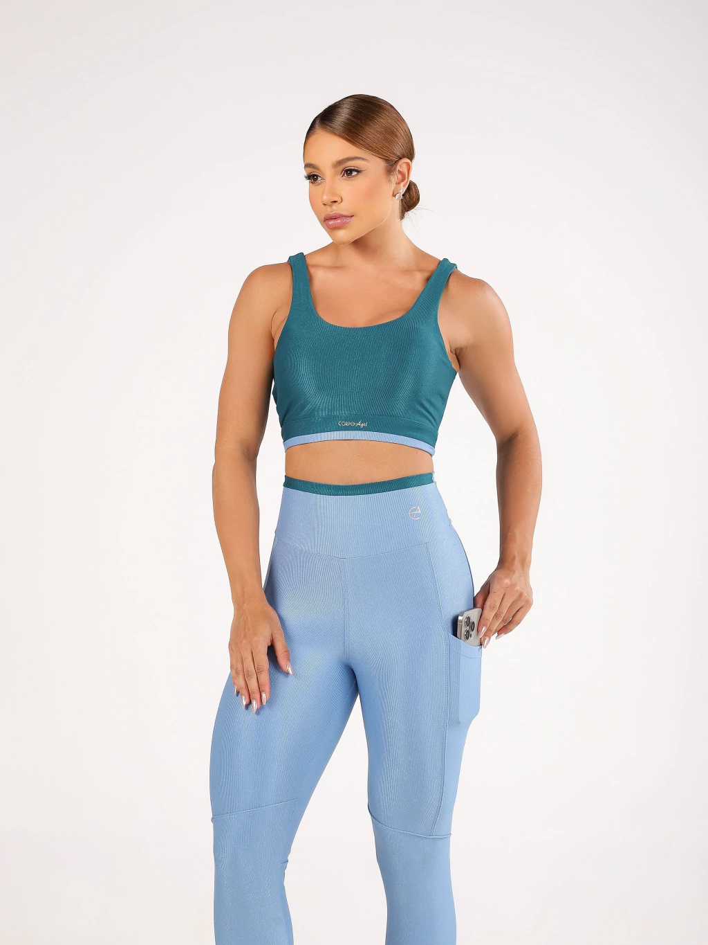 O top possui um decote U sutil à frente e um decote profundo em V nas costas, com alças grossas que garantem sustentação e conforto. Seu comprimento mais alongado traz um detalhe especial no cós, que confere um toque de estilo e exclusividade ao conjunto.
