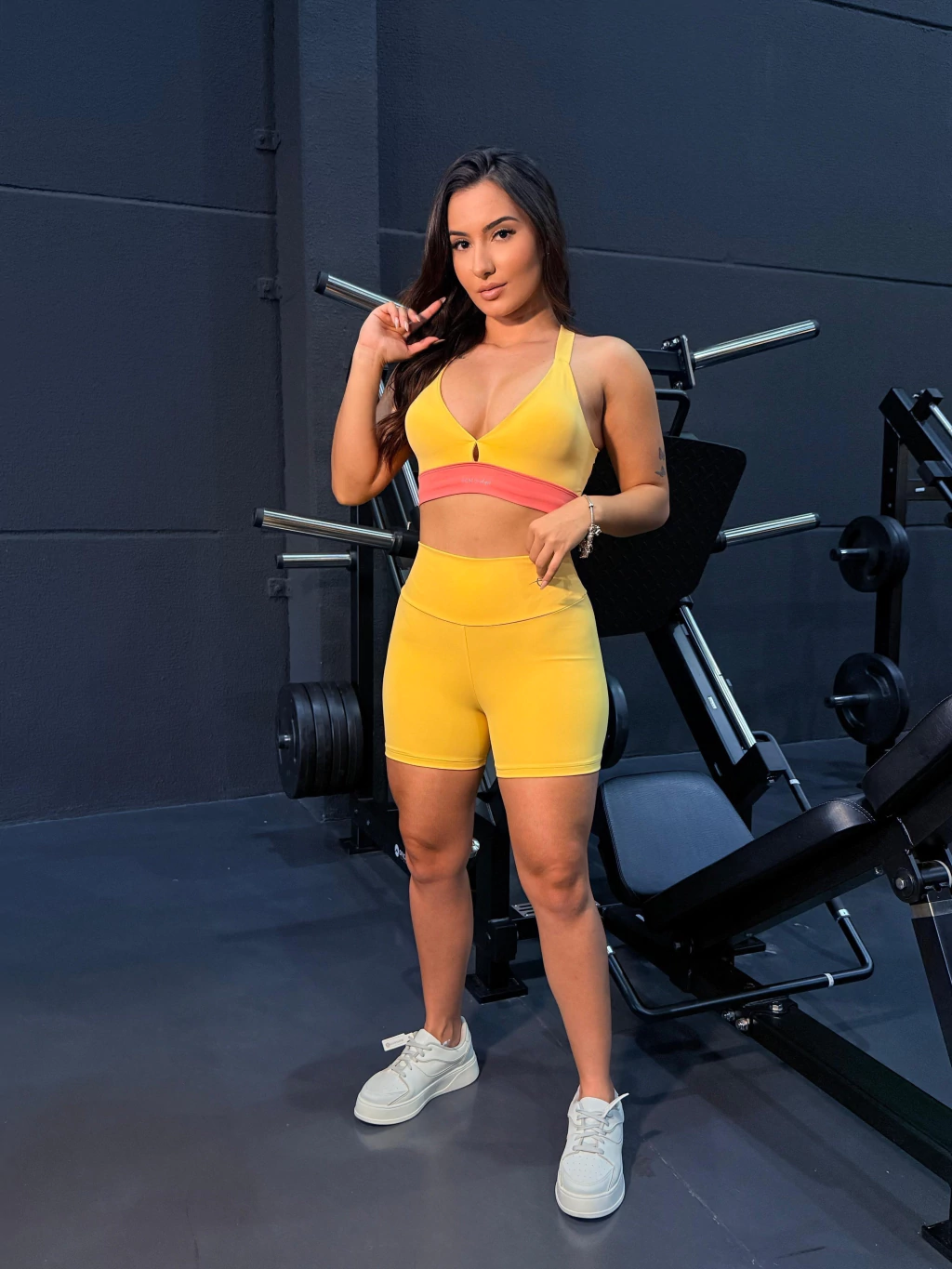 Descubra o Conjunto short Color, um conjunto composto por short curto de modelagem básica com cós alto anatômico que valoriza a silhueta e proporciona um ajuste perfeito para o seu dia a dia. O top traz um elegante decote em V, com alças grossas e elástico embutido cruzado, garantindo mais conforto e sustentação para você se movimentar com liberdade. A barra em cor contrastante adiciona um toque de sutileza e feminilidade, tornando o conjunto ainda mais especial. E a cor amarela é forrada.